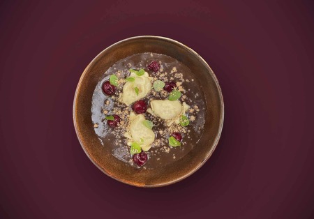 Z pierożkami z gęsiną, suszonymi owocami, wiśniami w winie i świeżym majerankiem. (430g)