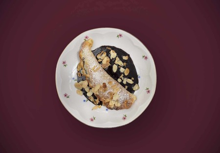 Kruchy pieróg z białym makiem, orzechami włoskimi, prażonymi migdałami i skórką pomarańczy, podawany z sosem czekoladowym. (1 szt)