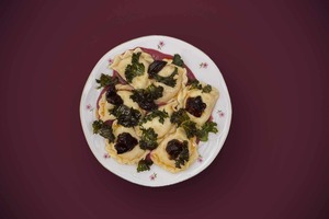 Tradycyjne gotowane pierogi z gęsiną ,puree z modrej kapusty, śliwką w winie i chrupiącym jarmużem (7szt)
